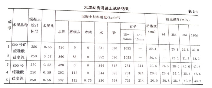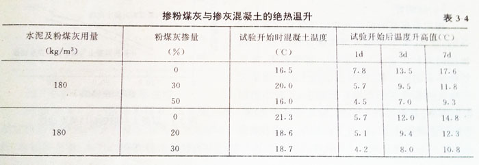 在大體積混凝土中,使用普通硅酸鹽水泥,由于水泥水化時硅酸三鈣(C3S)和鋁酸三鈣(C3A)作用發生熱量,Ig硅酸鹽水泥的總放熱量可達502J,因而導致混凝土溫度升高以至溫差收縮引起的裂縫。在普通混凝土中摻入粉煤灰后,水化熱明顯降低。表3—4是混凝土溫升狀況。由表列數據可知,摻30%粉煤灰與不摻粉煤灰的混凝土相比,絕熱溫升低27%~33%,較高溫升降低30%,并且可以減少或完全不需要人工冷卻措施。