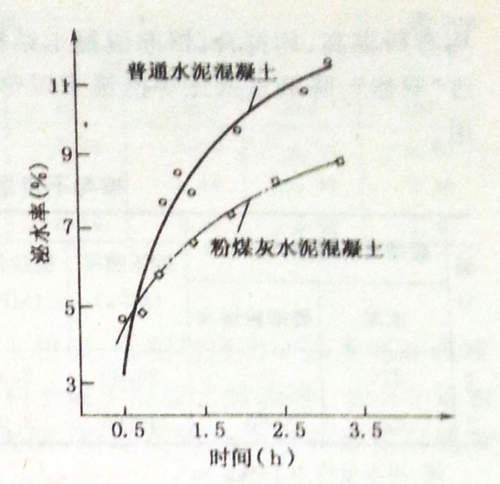 根據圖3—1所示,粉煤灰混凝土的總泌水率小于普通混凝土,說明粉煤灰土不易發生離析,有利于改善混凝土施工時的均勻性,提高混凝土的密實性和耐久性。